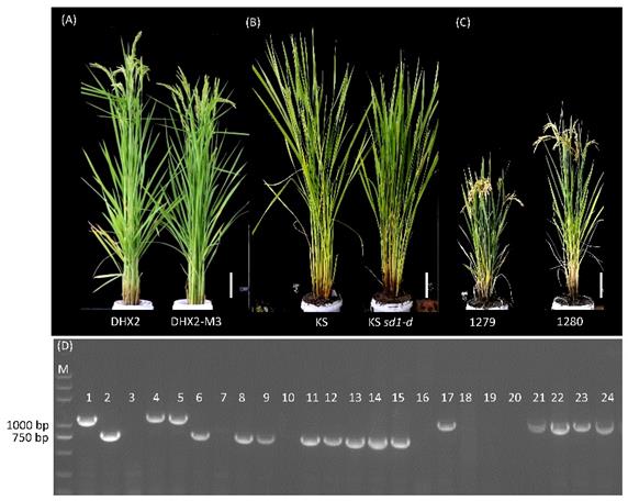 近日,中國科學院東北地理與農業生態研究所方軍研究員團隊在The Crop Journal在線發表了題為“Elite sd1 alleles in japonica rice and their breeding applications in northeast China”的研究論文。通過數據庫挖掘、文獻追蹤、系譜分析以及分子標記驗證等手段對粳稻中sd1的優異單倍型及相應的種質資源進行了分析,明確了除SD1-EQ外,sd1-r主要分布在中國北方和日本東北地區粳稻材料中,而sd1-j也在中國華東地區和日本九州的部分粳稻品種中存在。通過分析其衍生后代,發現“東農”和“秀水”系列品種分別是粳稻骨干親本秋光和測21的重要分支,二者分別攜帶sd1-r和sd1-j等位基因。這說明sd1-r和sd1-j在當前粳稻育種中得到有效利用,可以用來改良大部分SD1-EQ型水稻品種,提高粳稻的抗倒性。其中攜帶sd1-r等位基因的東北粳稻材料有東農系列品種(東農419、東農423、東農427、東農糯418、東農9006),龍稻10、龍稻21、牡丹江21以及吉粳101,值得注意的是衍生自東農423的東農427和龍稻21在生產上表現出極好的抗倒伏性。進一步利用分子輔助選擇,將sd1-d導入稻花香2號(DHX2),并獲得了攜帶sd1-d的矮桿和半矮桿株系(1279和1280),預計這兩個品系將成為未來遺傳研究和育種的重要中間材料;同時由于sd1-d是功能缺失型,也意味著可以利用基因編輯技術快速創制其他不同類型缺失型sd1加以利用。這項工作將有助于引種,親本選擇,分子標記輔助選擇育種,并為下一步挖掘粳稻骨干親本中與sd1共同選擇的有利基因提供材料基礎。