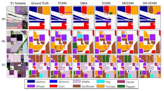 研究人員使用UAVSAR(S1)和Rapideye(S2)兩種高分遙感影像對提出的SS-OCNN有效性進行了驗證。研究結果表明,使用多個卷積窗口SS-OCNN方法比使用單一卷積窗口OCNN方法農作物分類精度提高3%-10%,極大地改善了農作物種植結構信息遙感提取精度。此外,一些傳統方法難以區分的小生物量作物(例如飼草類),其分類精度也得到了顯著的提高,進一步證實了多尺度觀測信息對于深度學習農作物種植結構信息提取的必要性。