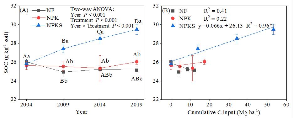 對于高強(qiáng)度利用的農(nóng)田生態(tài)系統(tǒng),秸稈還田被認(rèn)為是提升土壤有機(jī)碳、改善土壤肥力的有效措施。基于全球數(shù)據(jù)的Meta分析表明,連續(xù)12年的秸稈還田后土壤有機(jī)碳將達(dá)到飽和狀態(tài),因此,要揭示連續(xù)秸稈還田條件下土壤有機(jī)碳的動態(tài)變化規(guī)律,需開展長期的田間動態(tài)觀測。
