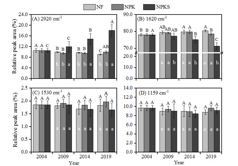 圖3 土壤在2920, 1620, 1530 和1159 cm-1處的紅外光譜吸收峰面積