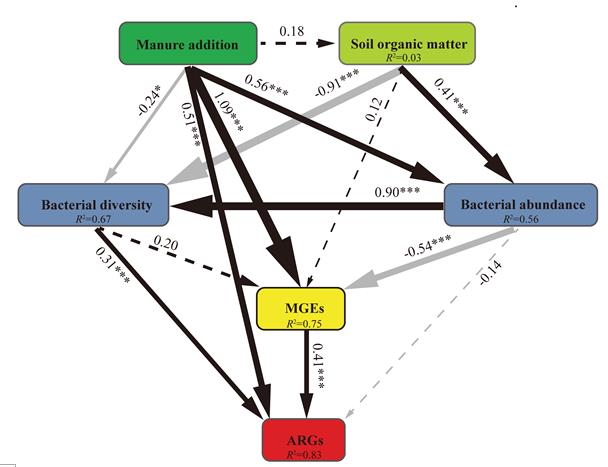 圖3結構方程模型(SEM)闡明了糞肥添加、土壤有機質、細菌多樣性、細菌豐度和MGEs對ARGs的直接和間接作用