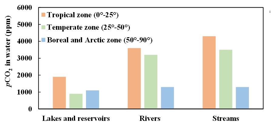 圖1 不同內(nèi)陸水體中pCO2分布情況,數(shù)據(jù)來(lái)源于文獻(xiàn)Aufdenkampe, A.K. et al. Frontiers in Ecology and the Environment, 2011, 9: 53-60, doi:10.1890/100014.