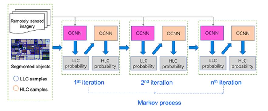 東北地理所地理信息系統學科組研究人員,針對高分影像復雜農業區作物種植結構信息提取難題,提出了一種新穎的迭代深度學習方法(Iterative Deep Learning (IDL)),在國際上首次發現并利用不同作物層次之間相關關系提高農作物遙感分類精度。IDL將作物按層級劃分為高層次作物(HLC,例如糧食作物、蔬菜作物等)和低層次作物(LLC,例如玉米、大豆等),并將HLC和LLC的分類結果納入統一的深度學習遙感分類框架。LLC作為HLC分類的條件概率,而HLC聯合遙感影像作為LLC分類的條件概率,如此迭代策略構成馬爾科夫鏈,使得LLC和HLC分類在迭代過程中協同進化、彼此修正,最終實現了LLC和HLC分類精度的共同提高。