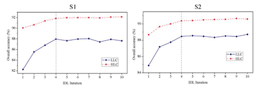 圖2. 迭代深度學習中LLC和HLC分類精度隨模型迭代次數增加的變化圖