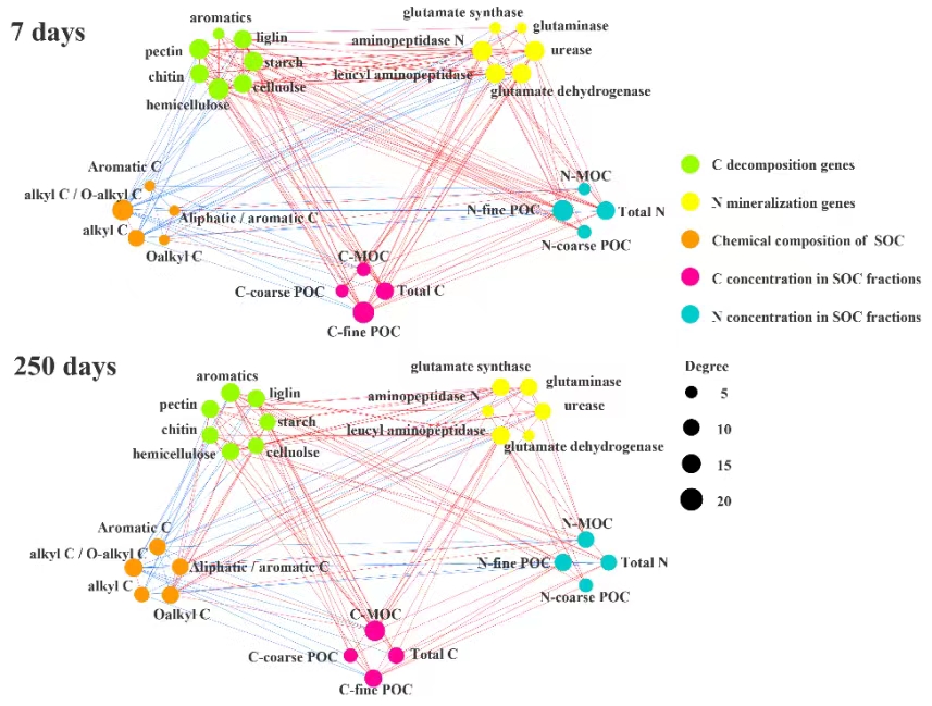 圖3. 培養7天和250天后土壤有機碳結構、有機質組分碳氮含量以及氮礦化和碳降解功能基因豐度的相關性網絡
