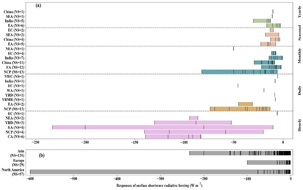 圖2 氣溶膠反饋效應(yīng)導(dǎo)致亞洲不同地區(qū)和時(shí)間尺度地面短波輻射強(qiáng)迫的變化情況及其與歐美地區(qū)的對(duì)比分析