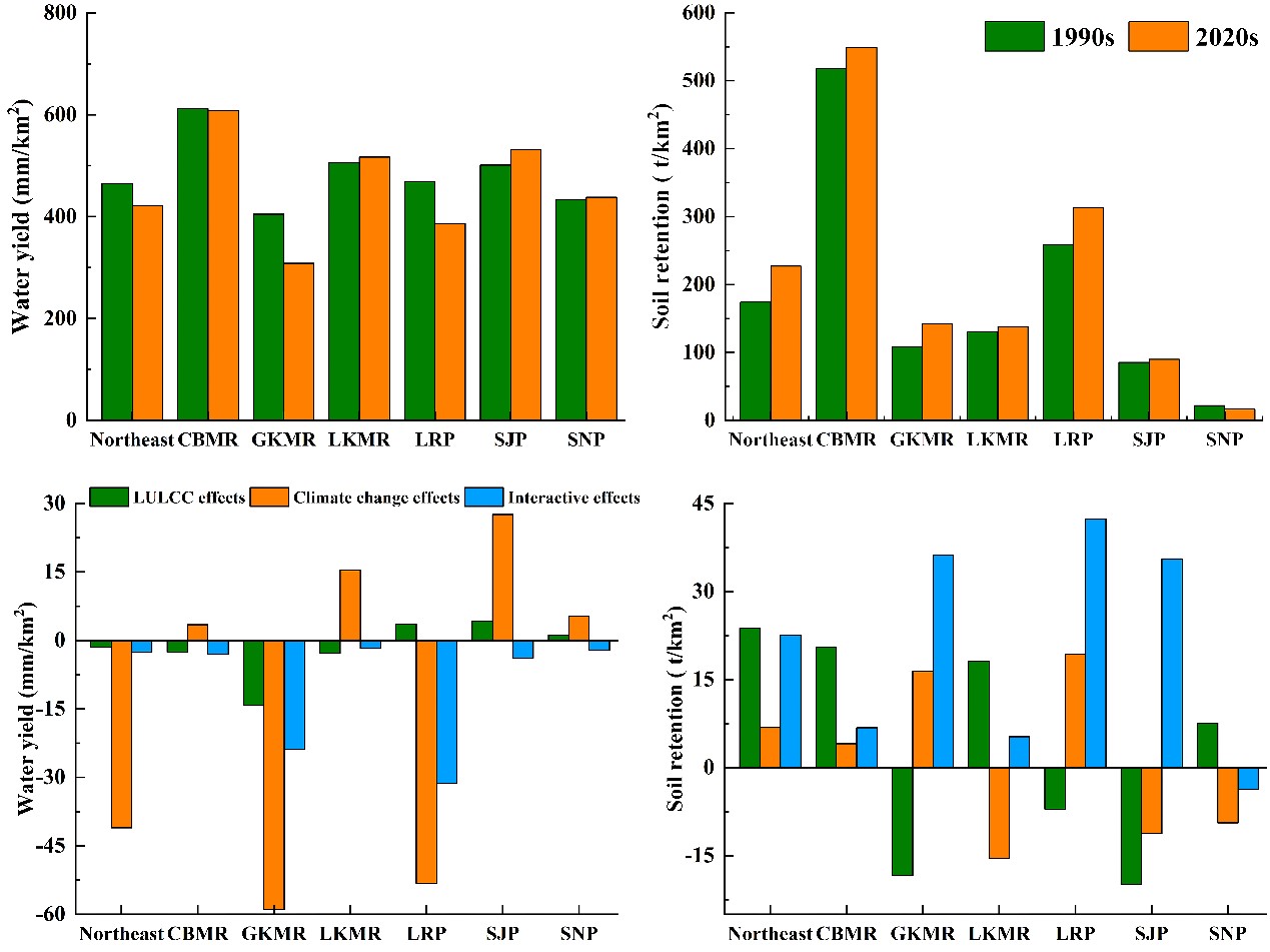 圖2. 長(zhǎng)白山地區(qū)產(chǎn)水量和土壤保持量變化和氣候變化與LUCC對(duì)其交互作用