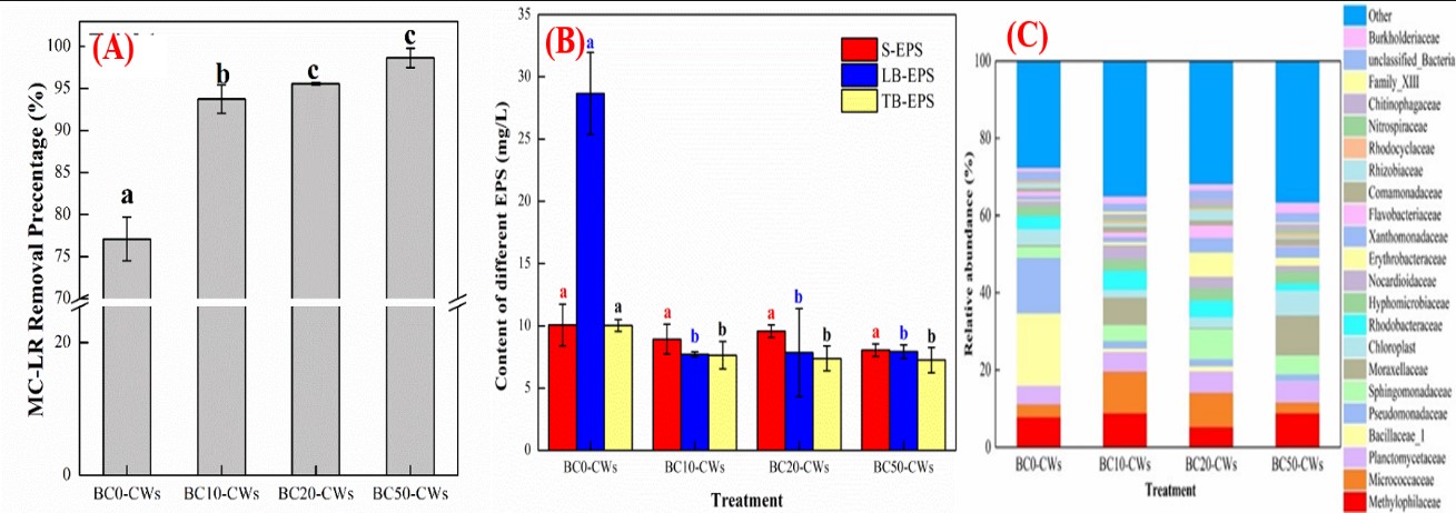 研究結(jié)果表明:(1)MFC-CWs在48 h之內(nèi)便可實現(xiàn)對水中N、P和MC-LR的高效去除,且閉路運行(T1)的MFC-CWs在N、P和MC-LR的去除性能方面要顯著(p < 0.05)優(yōu)于開路運行(CK)系統(tǒng),主要是因為MFC-CWs中存在較多的微囊藻毒素降解菌(如:鞘脂單胞菌科(Sphingomonadaceae)、伯克氏菌科(Burkholderiaceae)、微球菌科(Micrococcaceae)和黃單胞菌目(Xanthomonadales)),系統(tǒng)內(nèi)電子轉(zhuǎn)移速率和微囊藻毒素降解菌相對豐度的提高是MFC-CWs能夠高效凈化高濃度MC-LR(?15 μg/L)的關鍵;進一步通過海綿鐵對MFC-CWs的陽極區(qū)進行強化(T2),MC-LR的凈化效率并未得到提升(圖1)。(2)BC-CWs對N、P和MC-LR的去除效率顯著(p < 0.05)提升,而胞外聚合物的含量顯著(p < 0.05)降低(圖2B),從而降低了系統(tǒng)堵塞的風險;生物炭基質(zhì)吸附性能的提高和功能微生物相對豐度的增加是BC-CWs去除效率提高的主要原因。綜合去除效率和經(jīng)濟成本,建議實際應用中生物炭的最佳體積投加比為20%。