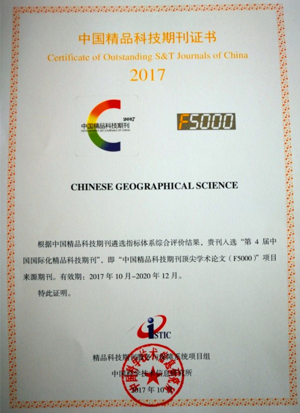2017年10月31日,中國科學(xué)技術(shù)信息研究所在北京國際會(huì)議中心舉辦了“2017年中國科技論文統(tǒng)計(jì)結(jié)果發(fā)布會(huì)”。東北地理所主辦的期刊《地理科學(xué)》和《Chinese Geographical Science》分別入選“第4屆中國精品科技期刊”和“第4屆中國國際化精品科技期刊”,即“中國精品科技期刊頂尖學(xué)術(shù)論文(F5000)”項(xiàng)目來源期刊,有效期為2017年10月—2020年12月。