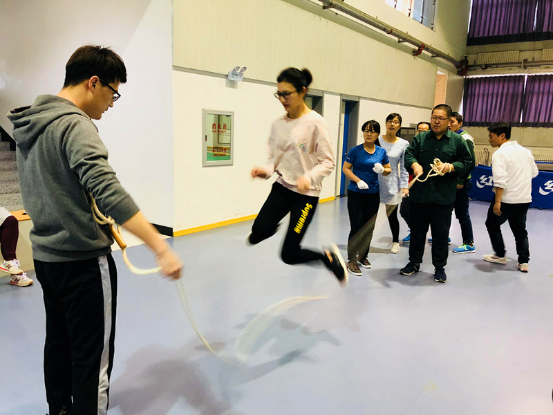 本次比賽包括團體跳繩和拔河兩個項目,以班級為單位分為四支代表隊參賽。在首先進行的團體跳繩比賽中,伴隨著繩起繩落,選手們次序井然、你來我往,輕盈敏捷的身手不時博得場外觀眾的陣陣掌聲。最終,2016級博士代表隊技高一籌,獲得了團體跳繩比賽的第一名。
