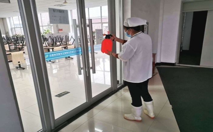 在各辦公樓的樓道總會聞到一股消毒液的味道,雖然味道比較刺鼻,但是會讓職工的心里感到一絲寬慰。每天后勤部門組織人員對所區重點防控部位進行兩次消殺,兩天進行一次全所范圍消殺。