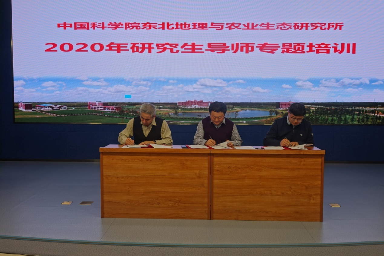 王玉榮向與會導(dǎo)師宣讀了《中國科學(xué)院東北地理與農(nóng)業(yè)生態(tài)研究所立德樹人崗位責(zé)任書》,姜明、李秀軍和武海濤作為導(dǎo)師代表率先簽訂了責(zé)任書,參會導(dǎo)師集體簽訂責(zé)任書,本次培訓(xùn)會圓滿結(jié)束。