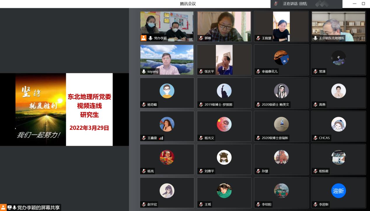 為進一步做好疫情防控工作,深入了解研究所靜態管理期間研究生的學習、生活、思想狀態,傾聽意見、征求建議,3月29日,東北地理所黨委與32位研究生代表進行視頻連線。黨委書記蘇陽,黨委副書記、紀委書記王曉慧,副所長王宗明及各職能部門、物業公司負責人參與視頻慰問,此次活動由黨委辦公室主任李穎主持。