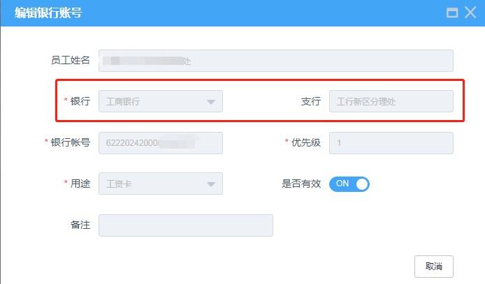 路徑為:人力資源—員工自助—銀行賬號維護,選擇優先級為“1”的“工資卡”右側編輯按鈕,核對其中“銀行”及“支行”信息是否有誤。