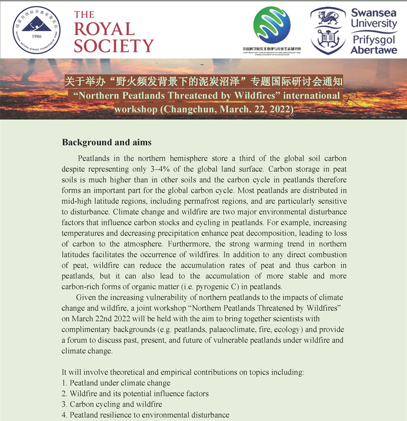 關(guān)于舉辦“野火頻發(fā)背景下的泥炭沼澤”專(zhuān)題國(guó)際研討會(huì)通知“Northern Peatlands Threatened by Wildfires” international workshop (Changchun, March. 22, 2022)